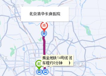 北京南站 步行 10米 北京南站 上車 地鐵14號線 (善各莊方向) 3站 蒲黃榆站 下車 站內(nèi)換乘 步行 170米 蒲黃榆站 上車 地鐵5號線 (天通苑北方向) 19站 天通苑站 (B南口出) 下車 步行 410米 北京清華長庚醫(yī)院