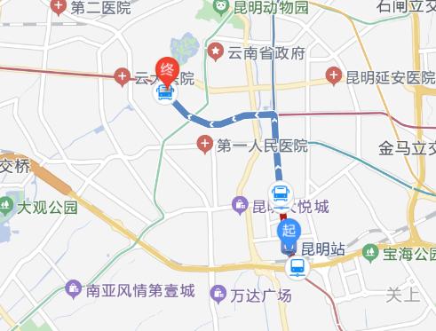 上車(chē)站昆明火車(chē)站(A口進(jìn))起昆明站 步行 80米 至 昆明火車(chē)站(約2分鐘) 地鐵1號(hào)線(環(huán)城南路方向) 昆明火車(chē)站 上車(chē)(A口進(jìn)) 環(huán)城南路 下車(chē)(E口出) 上車(chē)站 首:06:42 末:23:27 約7分鐘/趟1站步行 245米 至 環(huán)城南路口(北京路)(約4分鐘) 26路(黃土坡方向) 環(huán)城南路口(北京路) 上車(chē) 小西門(mén)(東風(fēng)西路) 下車(chē) 首:06:00 末:22:00 5站 步行 165米 至 終點(diǎn)(約3分鐘) 終天明視光眼科診所