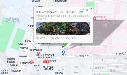 桂林站300米向東步行 到 桂林站5站乘 16路 (公交東環(huán)車場(chǎng)方向) 到 民主路310米向東北步行 到 中國(guó)人民解放軍第一八一醫(yī)院-南門中國(guó)人民解放軍第一八一醫(yī)院-南門